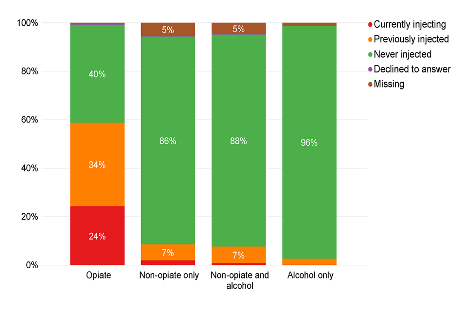 Bar chart of the current injecting status of people starting treatment split by substance group.