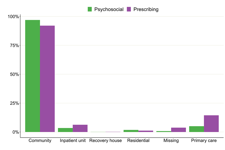 Bar chart showing the percentages of the breakdown of where people's treatment took place split by the type of intervention they received.