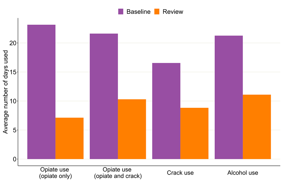 Bar chart showing the average number of days people used their problem substances divided by their baseline and 6-month review.