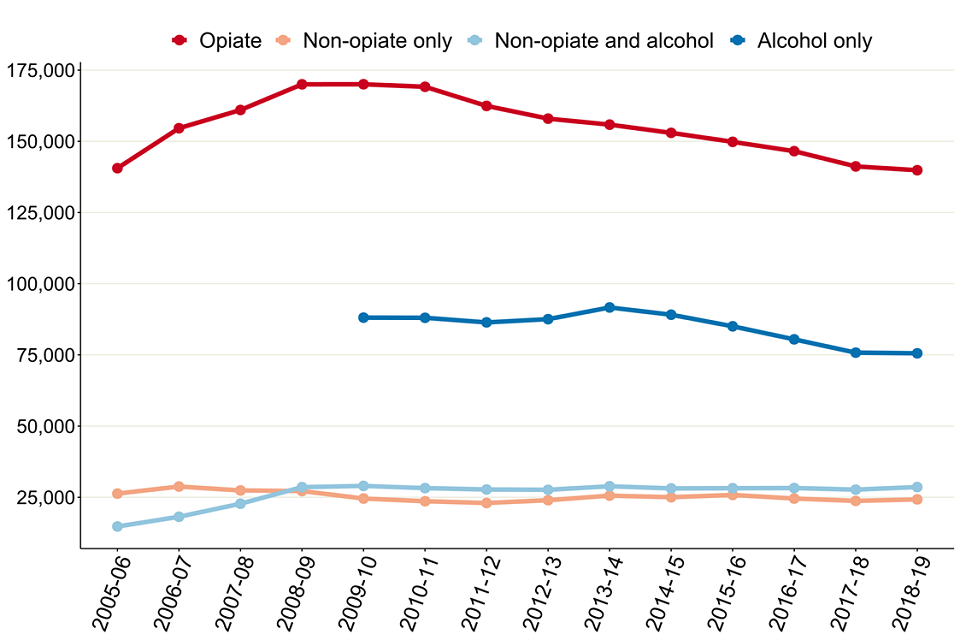 Numbers for people in treatment who said they had a problem with alcohol only are only shown from 2009 to 2010 onwards as that is when we started collecting national alcohol treatment data.