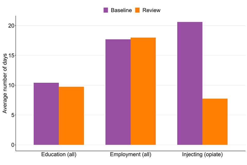 Bar chart showing the average number of days people in treatment reported injecting, in employment and in education by divided by their baseline and after the 6-month review.