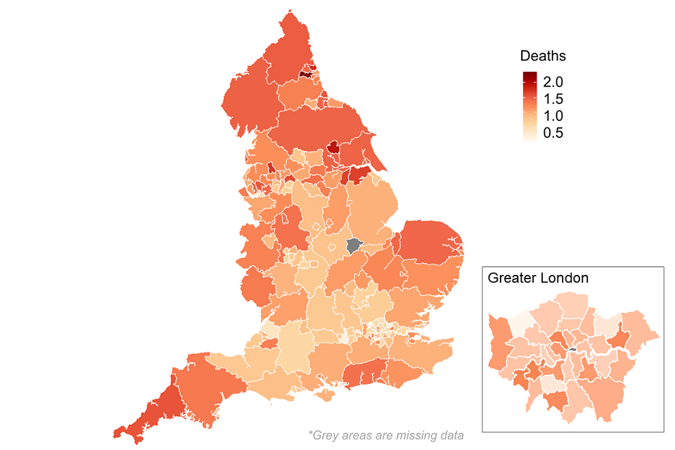 This map shows local authorities where deaths in drug treatment are higher or lower than expected (with a score of less than one being less deaths than would be expected). These figures are for people who die when they are in a treatment programme, not necessarily because their deaths are drug-related. It is calculated as an indirectly age-standardised ratio, and more detail can be found on the Public Health Dashboard.