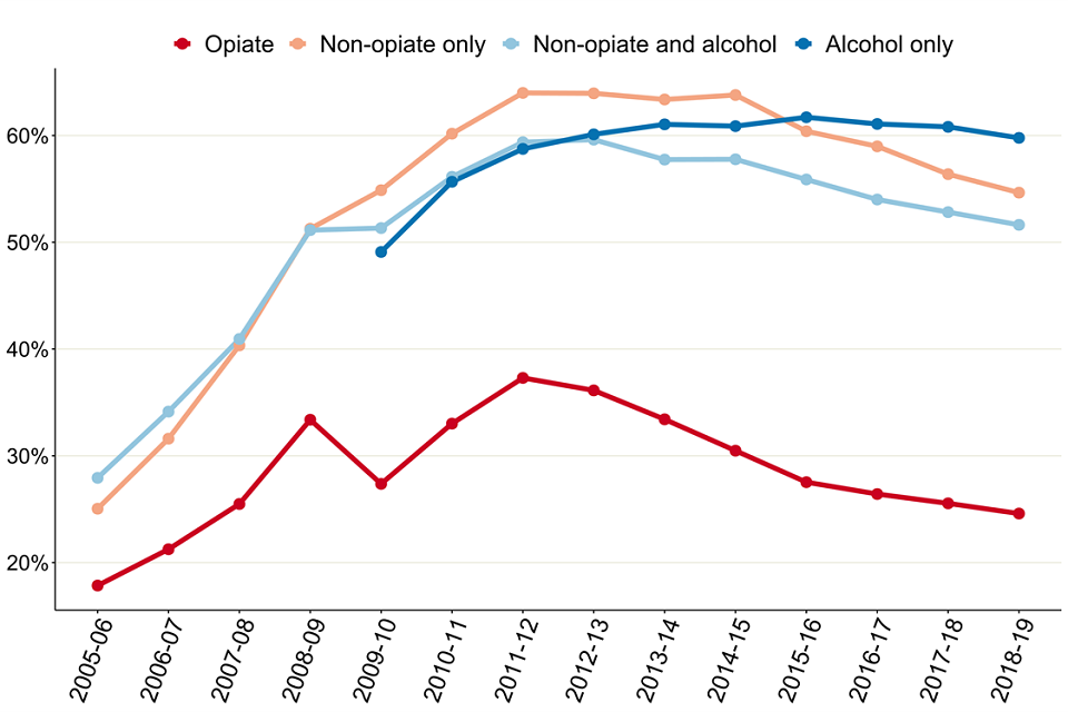 There have been slight increases in numbers in the non-opiate (2% increase) and non-opiate and alcohol (3%) groups while there has been a slight fall in the opiate group (down 1%).