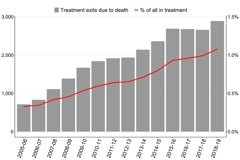The number of deaths in treatment has continued to rise, including a large increase since 2017 to 2018, from 2,660 to 2,889 people this year. This was 1.1% of all people in treatment. This trend has increased rapidly in recent years, from 712 deaths in 2005 to 2006 to 2,889 deaths in 2018 to 2019.