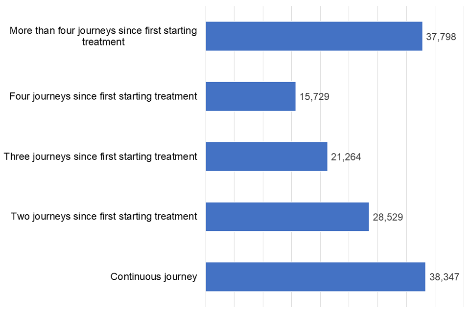 Of the people still in treatment at the end of March 2019, over a third (38%) have had 4 or more treatment journeys and over a quarter (27%) have been in treatment continuously.
