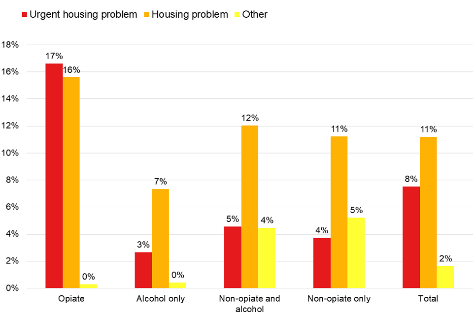 Nearly one-fifth of people (19%) starting treatment said they had a housing problem and 8% had an urgent problem. For people with opiate problems, the proportion with an urgent housing problem rose to 17%.