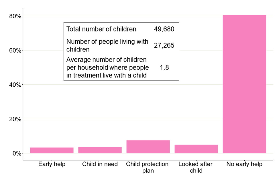 Bar chart showing the percentage of children living with people in treatment who are receiving early help or in contact with children's social care.