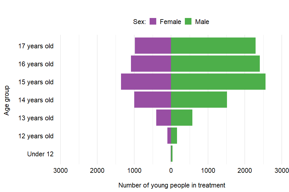 There were 14,485 young people in contact with drug and alcohol services in 2018 to 2019. Two-thirds were male (66%), which was the same proportion as the last 2 years. The median age for both male and female was 15 years old. The number of younger children (under 14) in treatment remained relatively low (9%).