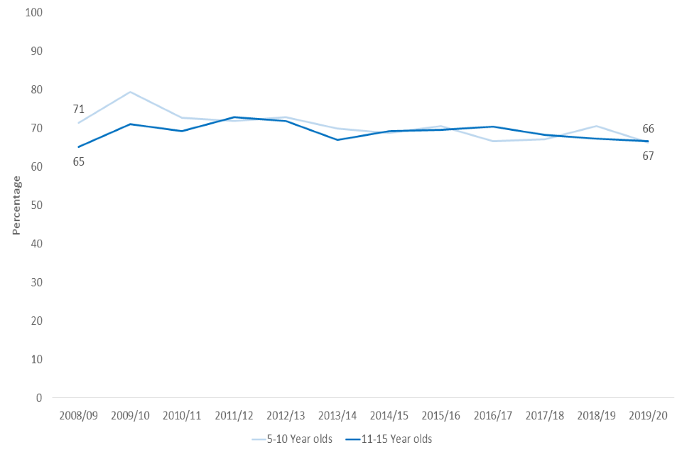 In 2019/20, a similar proportion of boys (67%) and girls (66%) aged 5-10 had visited a heritage site outside of school in the last 12 months. This is similar to 2018/19 for both boys and girls (70% and 71% respectively).