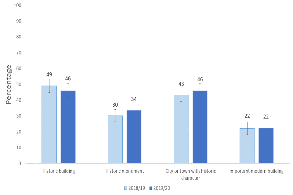 Figure 2.2: Proportion of children aged 11-15 years old who had visited different types of heritage sites in the last 12 months, 2018/19 and 2019/20