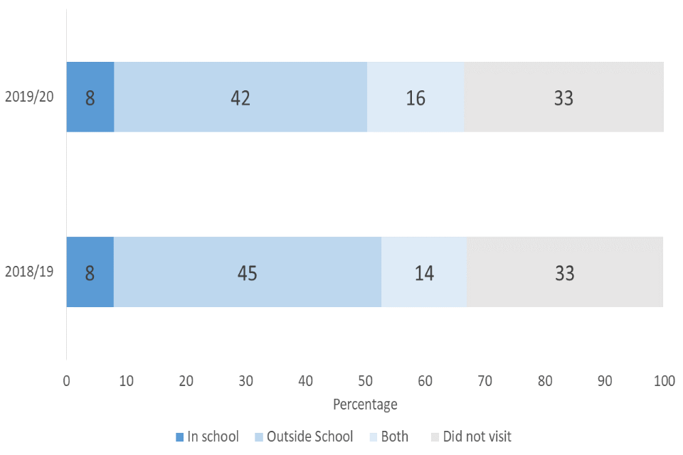 Figure 2.3 Proportion of 11-15 year olds that had visited a heritage site in the last 12 months split by in school and outside school engagement, 2018/19 and 2019/20