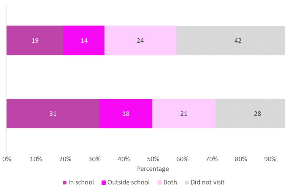 More 11-15 year olds (24%) visited a library both inside and outside of school, than outside school only (14%). The proportion of 11-15 year olds who visited a library outside of school time in 2019/20 (14%) was similar to the proportion in 2018/19 (18%), whilst less 11-15 year olds visited a library in school in 2019/20 (19%), than in the previous year 2018/19 (31%).