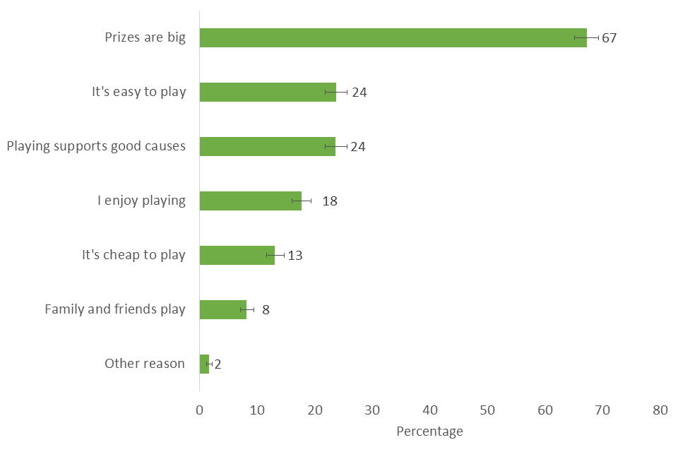 The most commonly reported reasons for playing National Lottery games were because prizes were big (67% of players), that playing supports good causes (24% of players), and that it’s easy to play (24% of players).