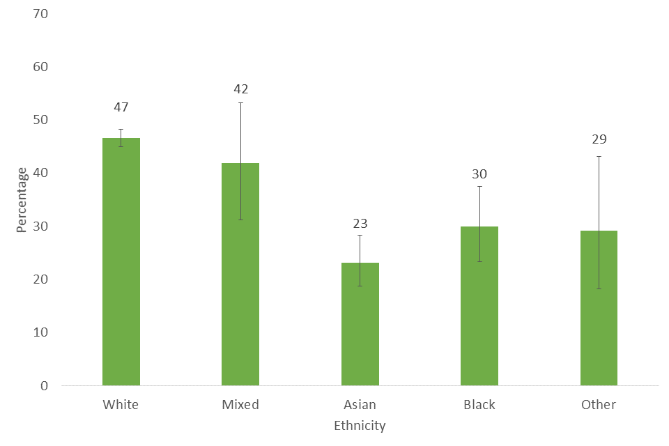 Figure 7.4 Percentage of respondents who have played any National Lottery game in the last 12 months by ethnicity, 2019/20