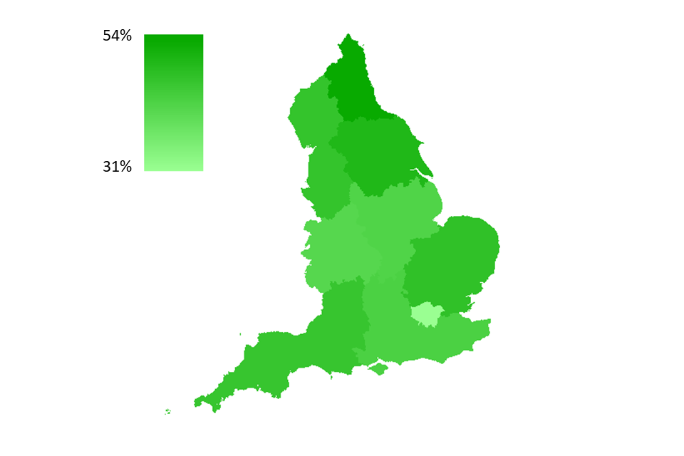 Figure 7.5 Percentage of respondents who have played any National Lottery game in the last 12 months by region, 2019/20
