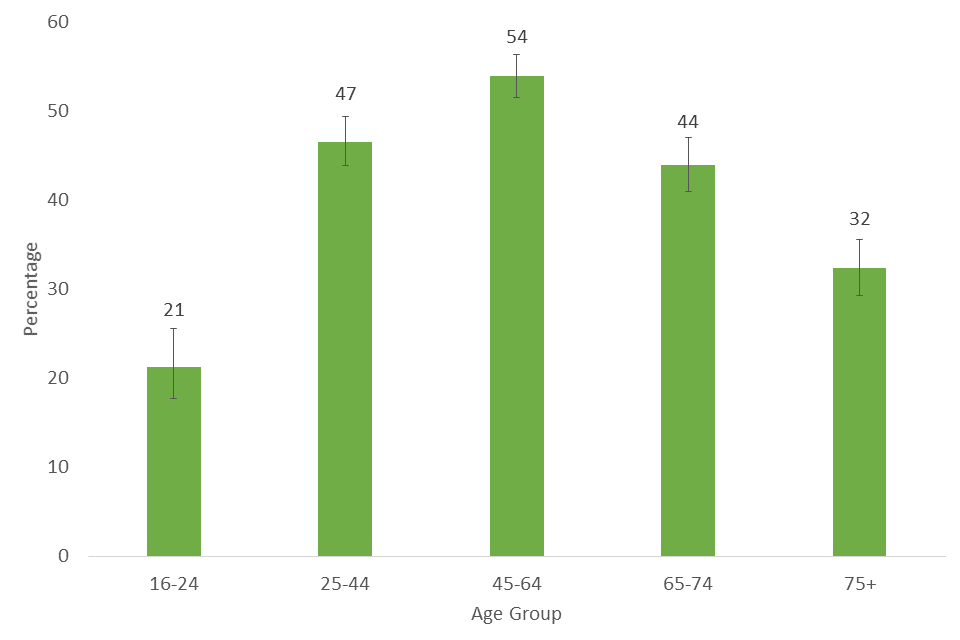 Figure 7.3 Percentage of respondents who have played any National Lottery game in the last 12 months by age, 2019/20
