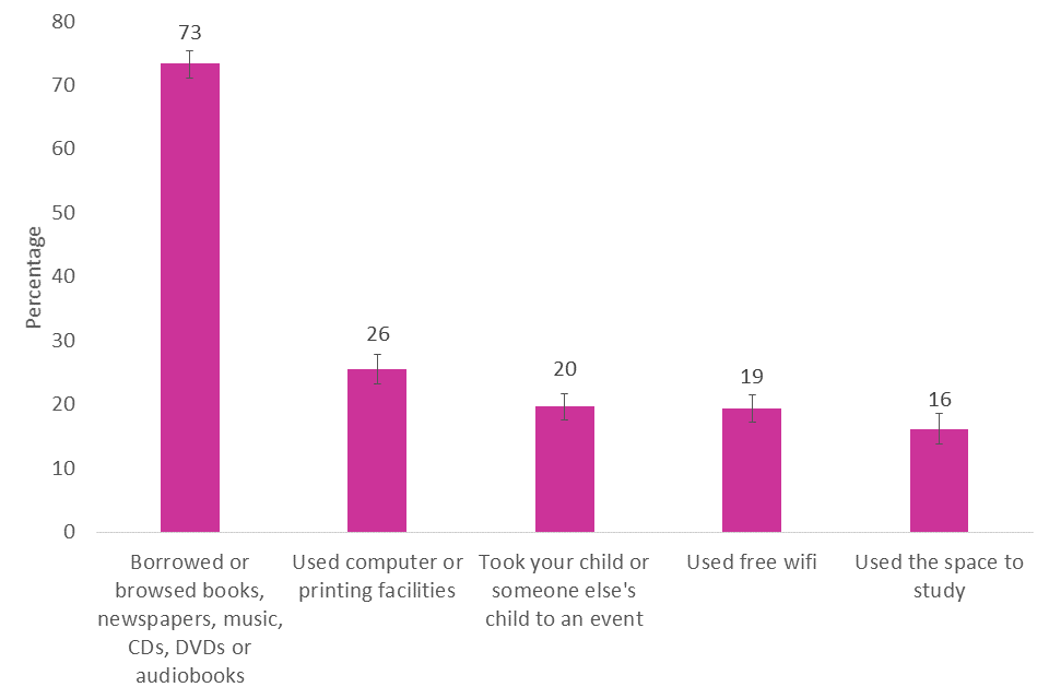 In 2019/20, 96% of respondents who had used a public library service (in own time or voluntarily) in the past 12 months reported having visited a library building or mobile library in that time. Of these, 73% reported having borrowed items such as books, newspapers, music, CDs, DVDs or audiobooks. The next most popular reason was to use a computer and printing facilities (26%) followed by taking their child or someone else’s child to an event (20%). No activities significantly changed in popularity from 2018/19.