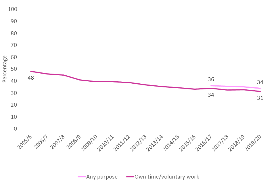 Percentage of respondents who have visited a library for any purpose, or for own time/voluntary work from 2005/6 to 2019/20