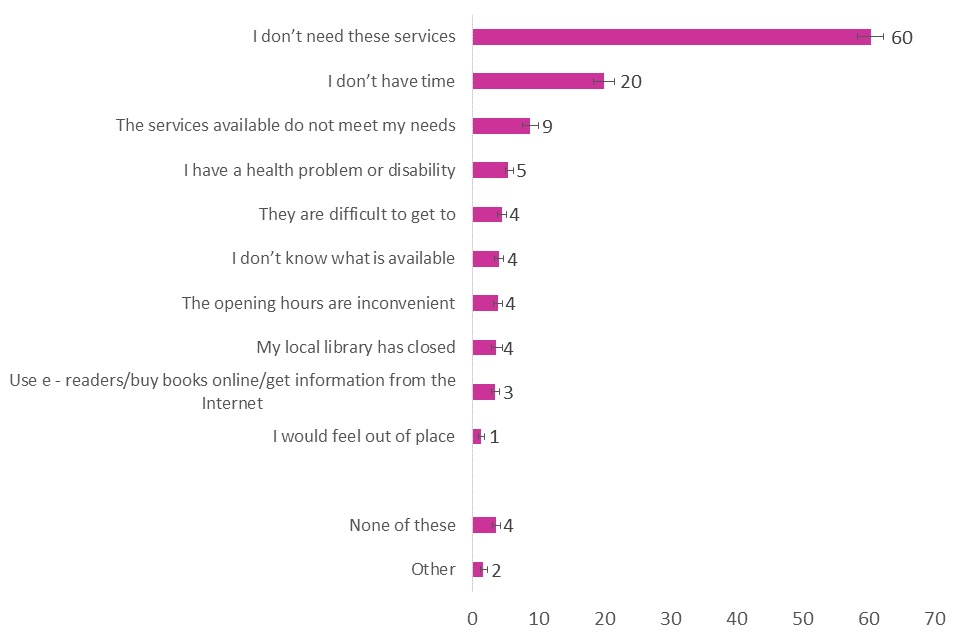 Those who had not used a library service in the last 12 months were asked for reasons for not doing so. In 2019/20, 60% reported that they did not need these services and 20% said that they did not have time.
