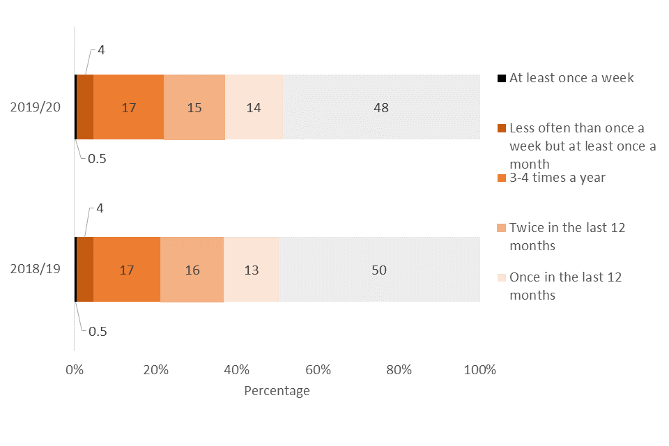 The survey asks about frequency of museum and gallery visits. In 2019/20, 0.5% of respondents said they has visited a museum or gallery at least once a week in the last 12 months, 4% at least once a month, 17% three to four times a year, 15% twice in the last 12 months, and 14% once in the last 12 months. Around half of the adult population (48%) reported that they had not attended a museum or gallery in the past 12 months. These estimates were similar to 2018/19.
