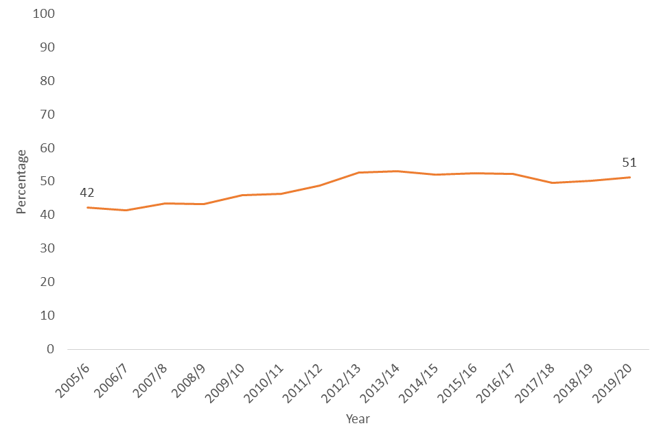 In 2019/20, 51% of respondents reported having visited a museum or gallery in the last 12 months. This is similar to 2018/19 and represents an increase from 42% in 2005/06.