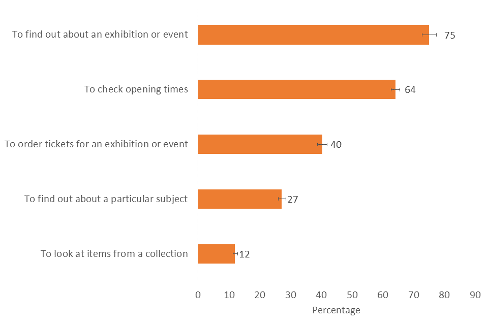 The most common reasons for visiting museum or gallery websites were ‘to find out about an exhibition or event’ (75%), ‘to check opening times’ (64%) and ‘to order tickets for an exhibition or event’ (40%). The popularity of the option ‘to find out about a particular subject’ dropped from 35% of visitors in 2018/19 to 27% in 2019/20.