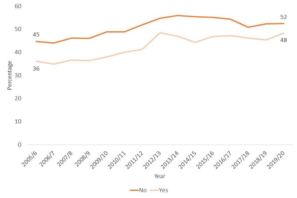 Percentage of respondents who have visited a museum or gallery in the last 12 months by presence of a long-term limiting illness or disability, 2005/6 – 2019/20
