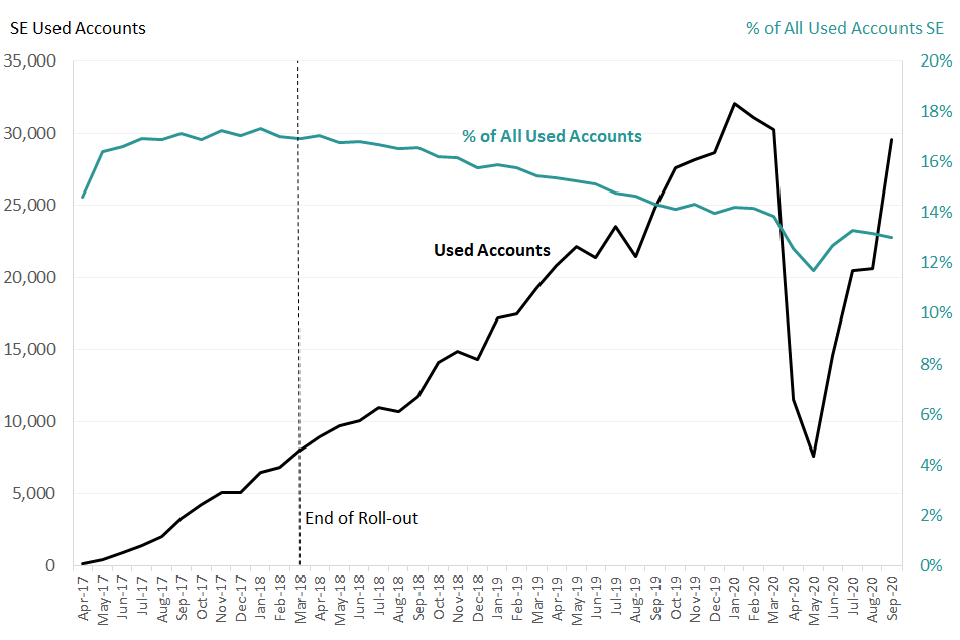 - growth in account use in school age children was slower than for pre-school children in months to August, there has been a large increase for all ages 5 years and above in September, although use is still below levels seen pre-lockdown