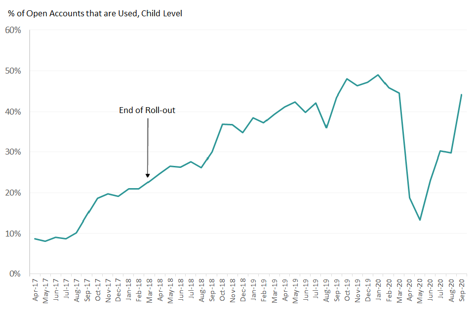 Figure 7: Percentage of open accounts which are used, by month. There has been a recovery in the percentage of open Tax-Free Childcare Accounts that are used since the COVID-19 lockdown.
