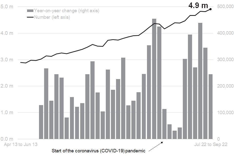 The number of disabled people in employment has increased by 2.0m from 2.9m in July to September 2013 to 4.9m in July September 2022 (an increase of 70.6%). The number continued to increase (year-on-year) throughout the coronavirus (COVID-19) pandemic but at a much slower rate. The increase has now returned to its pre-pandemic trend with 700,000 more disabled people in employment in July to September 2022 than there were in the same quarter in 2019.