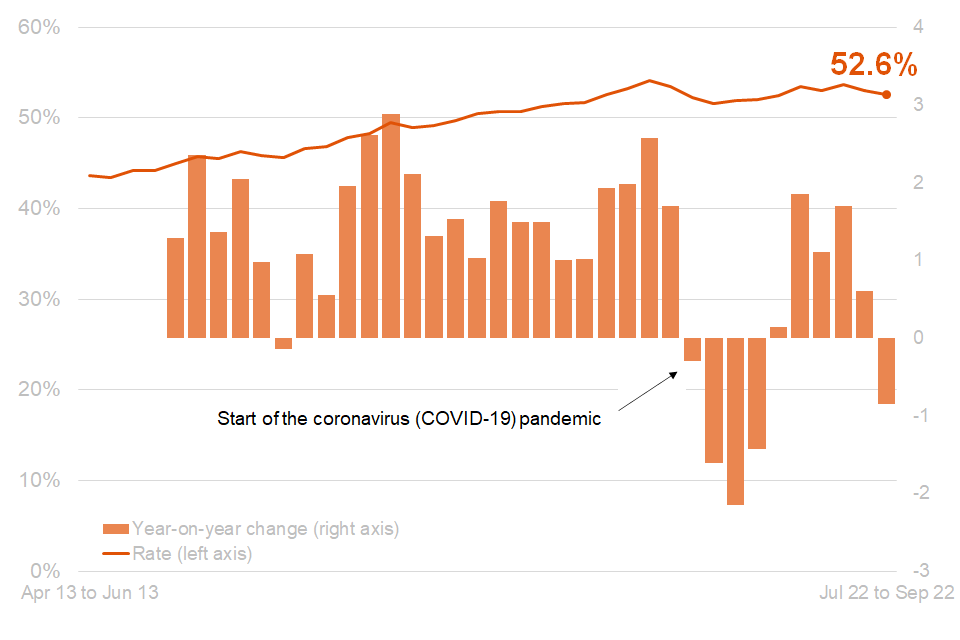 The disability employment rate has increased by 9.2 percentage points from 43.4% in July to September 2013 to 52.6% in July to September 2022. The rate began to fall (year-on-year) at the start of the coronavirus (COVID-19) pandemic before showing signs of recovery. The latest quarter (July to September 2022) showed the rate fall by 0.8 percentage points (compared to the same quarter last year) meaning the rate is now below where it was in 2019.