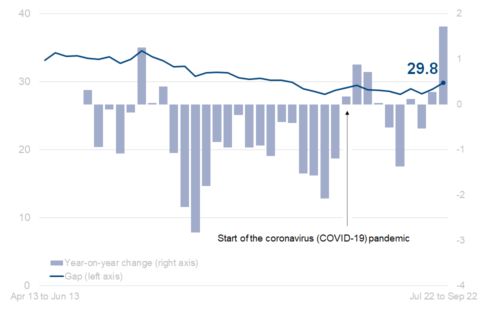 The disability employment gap has decreased by 4.4 percentage points from 34.2 percentage points in July to September 2013 to 29.8 percentage points in July to September 2022. The gap started to widen (year-on-year) at the start of the coronavirus (COVID-19) pandemic which was the first time this had happened across more than one quarter in eight years.