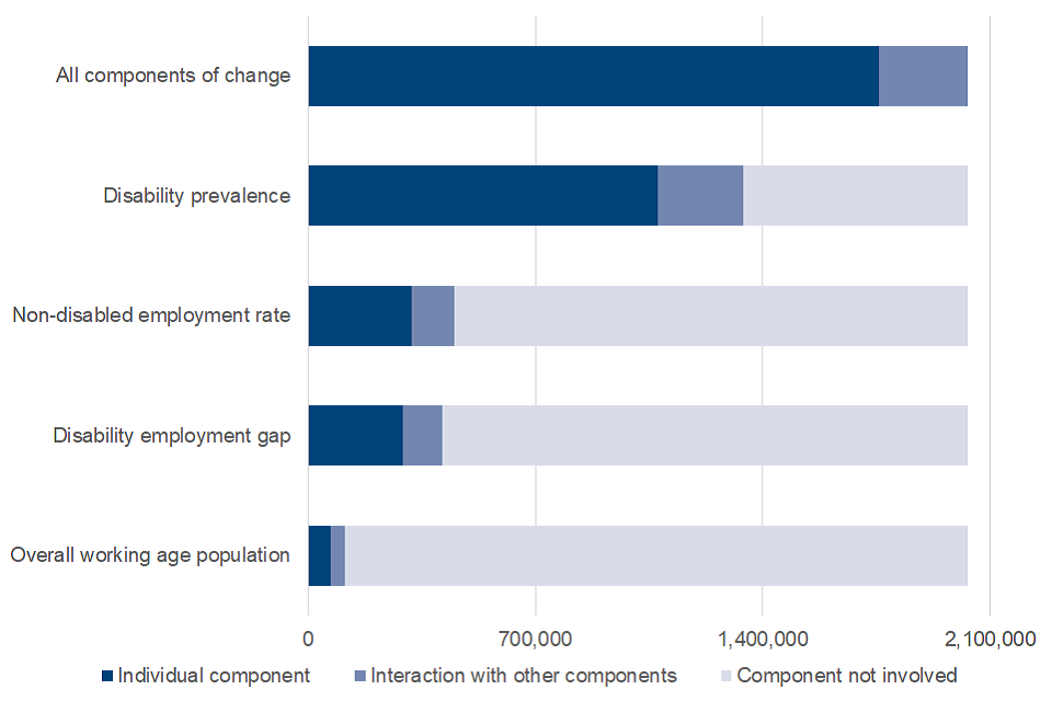 The longer-term increases in disability employment can be linked to four main factors: disability prevalence; non-disabled employment rate; disability employment gap and working age population. See figure 4 for more details.