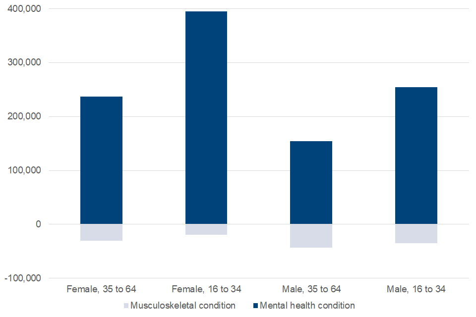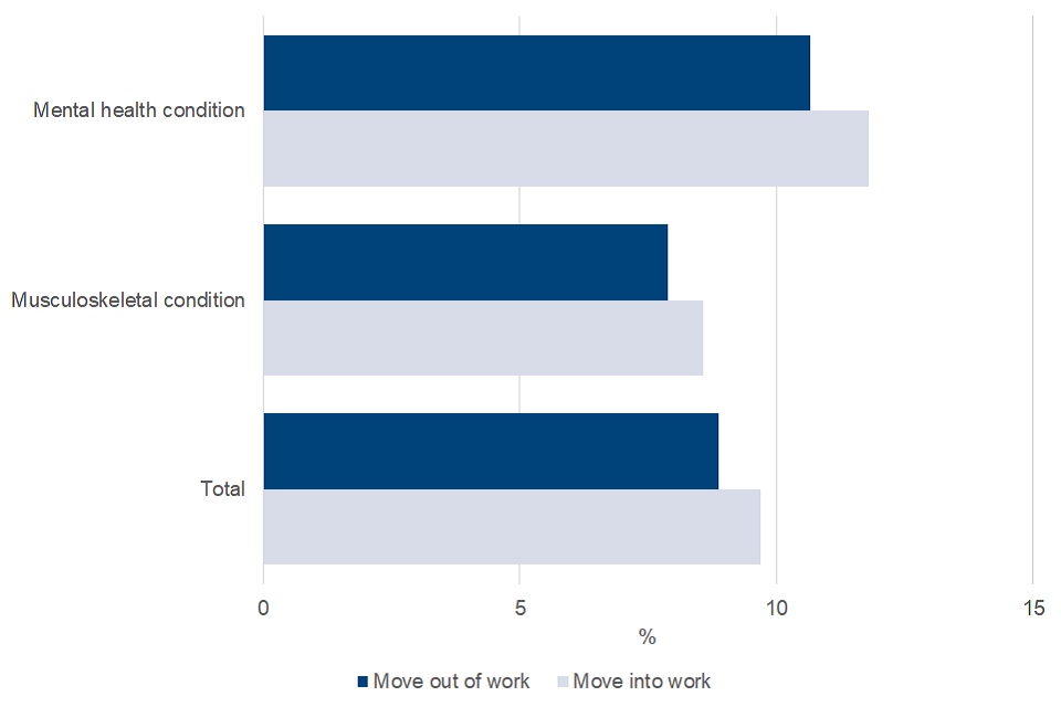 10.7% of those in work the previous year with a mental health condition moved out of work compared to 7.9% for those with a musculoskeletal condition.