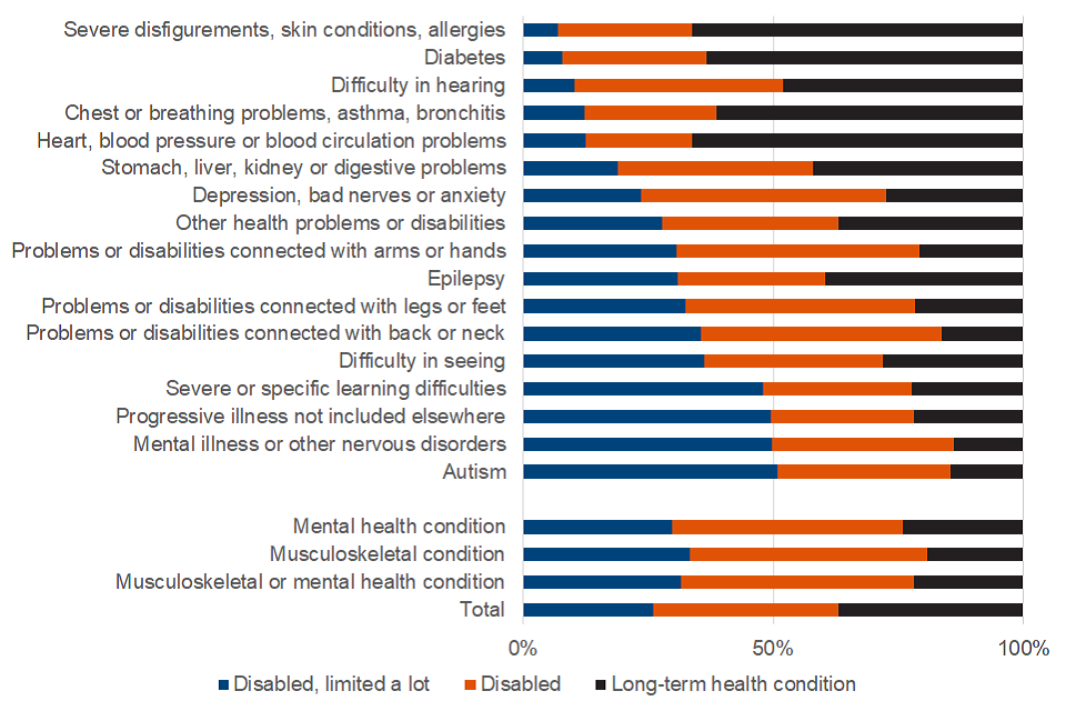 Estimates for some health conditions are based on small sample sizes and therefore subject to a higher degree of uncertainty. The data for all health conditions can be found insupplementary data table FLW003. The equivalent data for main or secondary health conditions can be found in supplementary data table FLW004. Unlike in Figure 25 disability status is measured in the first year regardless of whether it changes the following year.