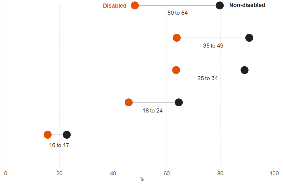 There were some signs of improvement, but the latest quarter (July to September 2022) showed the gap widen by 1.7 percentage points (compared to the same quarter last year). This was driven, almost equally, by a fall in the disability employment rate (0.8 percentage points) and a rise in the non-disabled employment rate (0.9 percentage points points).