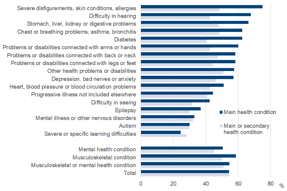 11.8% of those not in work the previous year with a mental health condition moved into work compared to 8.6% for those with a musculoskeletal condition.