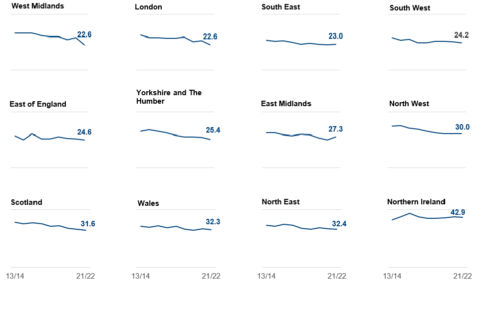Conversely, 95.7% of people who gave long-term sickness as their main reason for being economically inactive in 2021/2022 were disabled. This has remained stable at around 96% over the past nine years. This compares to looking after family / home (30.0% were disabled) and being a student (14.6% were disabled), which have increased by 8.9 and 5.7 percentage points respectively, and retirement which has decreased by 4.6 percentage points (24.1% were disabled). For all economically inactive people the increase in the percentage classed as disabled between 2013/2014 and 2021/2022 was 5.6 percentage points.