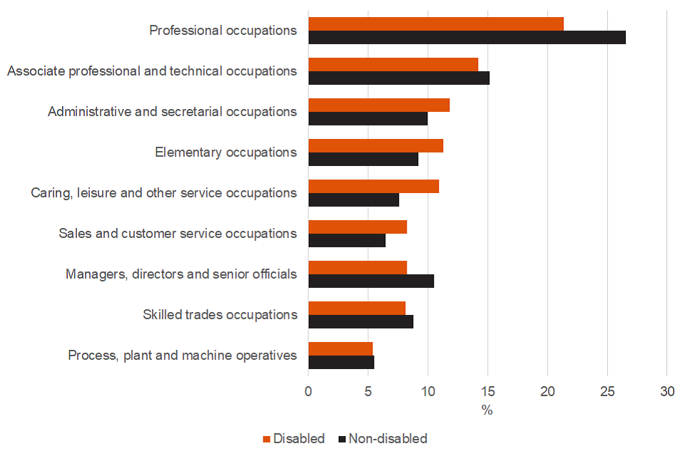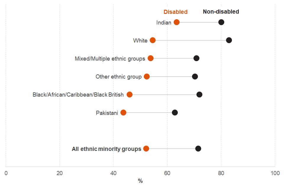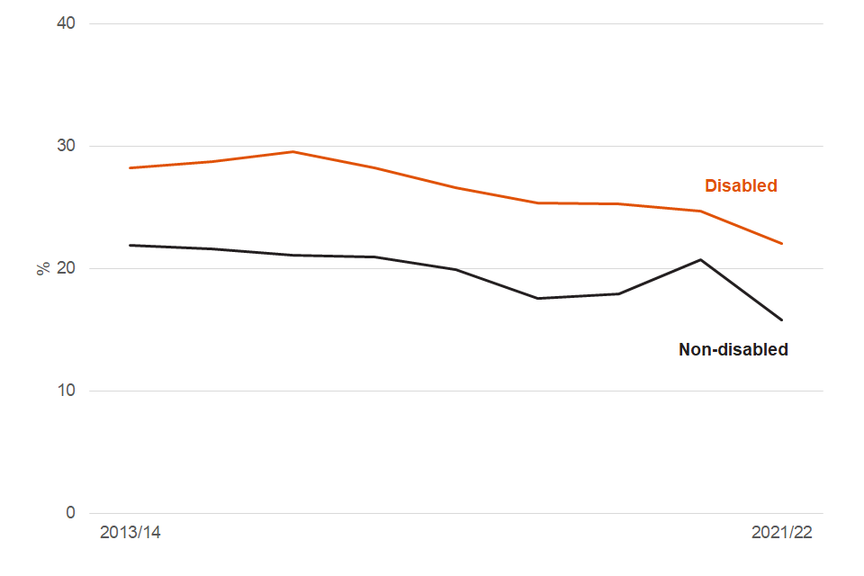 In 2021/2022, 59.3% of economically inactive disabled people had not had a job in the last two years compared to 33.5% of non-disabled people.