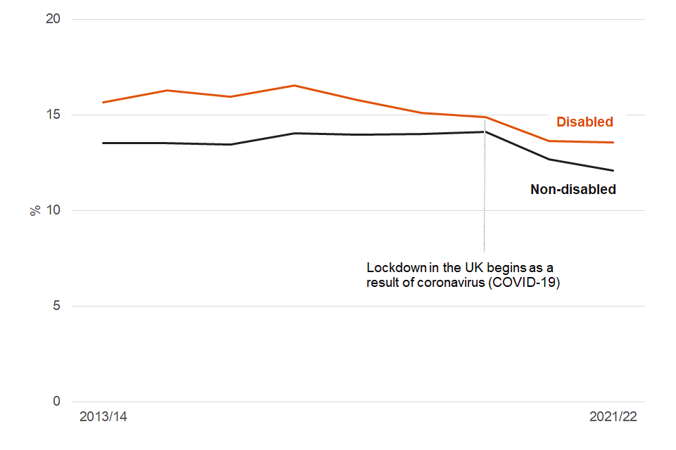 The proportions have generally fallen, for both disabled and non-disabled people, over the past nine years but the difference between the two is the same in 2021/2022 (6.3 percentage points) as it was in 2013/2014. The fall in the proportion of economically inactive people who want a job was greater in 2021/2022 than any other year since at least 2013/2014. This was 2.7 percentage points for disabled people and 5.0 percentage points for non-disabled people (this after rising during the first year of the coronavirus (COVID-19) pandemic).