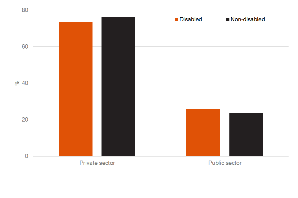 The proportion of disabled people working in the public sector remained relatively stable between 2014/2015 and 2019/2020 – 23.1% to 23.7%. In 2020/2021 – the first year of the coronavirus (COVID-19) pandemic – the proportion increased to 26.5%. In 2021/2022 the proportion was 25.8%, which is 2.0 percentage points above that seen prior to the pandemic.