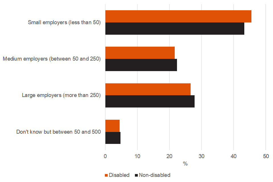 Disabled employees (excluding people who are self-employed) are more likely, than non-disabled employees, to be working for small employers and less likely to working for a large employer. They are equally likely to be working for a medium sized employer.