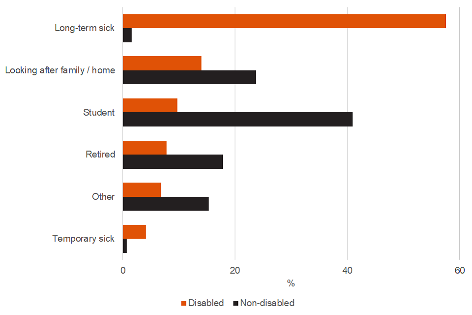 Economically inactive disabled people are less likely to have never had a paid job (25.0% compared to 44.1% for non-disabled people). However, they were less likely to be younger (29.3% are aged 16 to 34 compared to 53.4% of non-disabled people) and were less likely to give the main reason for being inactive as being a student (see Figure 22). This means that non-disabled people were more likely to still be in full-time education and may not yet have entered the labour market. This may partly explain why they are more likely to have never had a paid job.