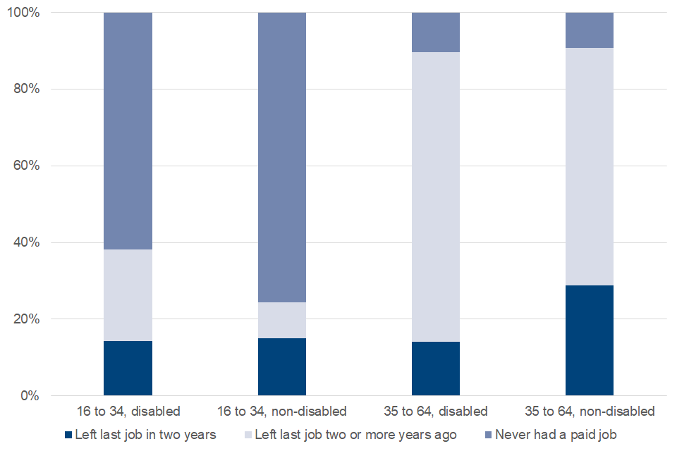 For economically inactive people aged 16 to 34, disabled people were more likely to have not had a job in the last two years (23.8% v 9.3%) but less likely to have never had a paid job (61.9% v 75.6%) - compared to non-disabled people. For the 35-to 64-year-old age group, disabled people were again more were more likely to have not had a job in the last two years (75.5.9% v 62.0%) and less likely to have had a job in the last two years (14.2% v 28.8%). Around one in ten of both disabled and non-disabled people aged 35 to 64 who are economically inactive have never had paid job.
