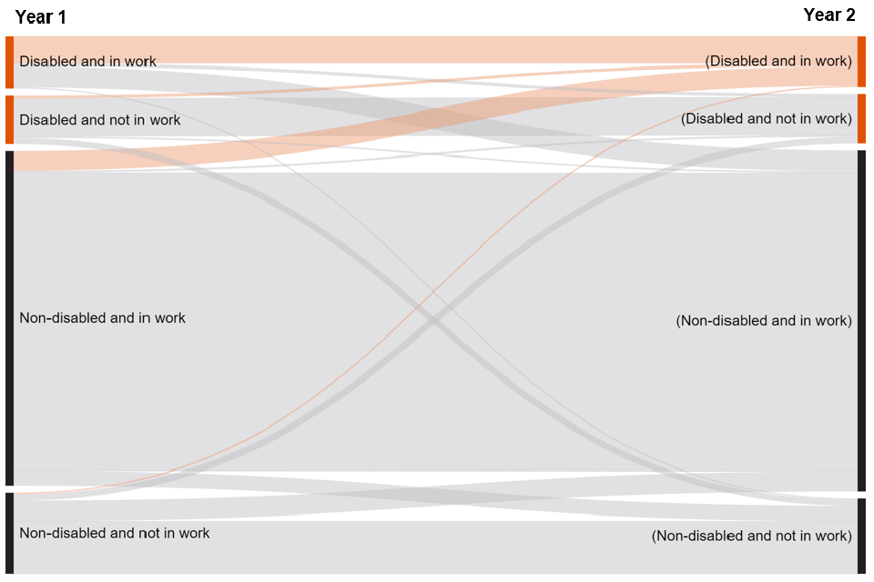 In general, disabled people are more likely to move out of work and less likely to move into work, compared to non-disabled people, over the course of a year.