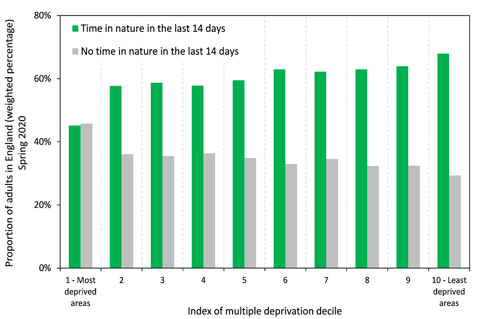 Index of Multiple Deprivation: Adults living in areas ranked as least deprived (represented as ‘10’ in Figure 2) are more likely to have visited a natural space in the last 14 days compared to those in areas ranked as most deprived (‘1’ in Figure 2). In the least deprived areas in England[footnote 3] 68% of adults had taken a visit to a natural space in the last 14 days, compared to 45% in the most deprived 10% of areas.
