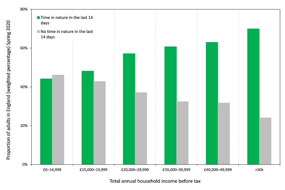 - With so many people not getting out into public natural spaces during COVID-19, private gardens were, for some, their main access to nature. However, nearly three times as many (16%) adults living in poverty don’t have access to any shared or private outdoor space, compared to only 6% of adults living in households with an income above £50,000 a year.