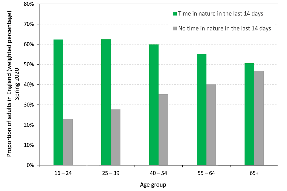 - Older people, people from minority ethnic groups, those with a long-term illness or condition, and those without children are less likely to have visited a natural space in the last 14 days.
