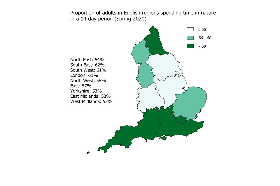 Proportion of adults in English regions spending time in nature in a 14 day period (Spring 2020)