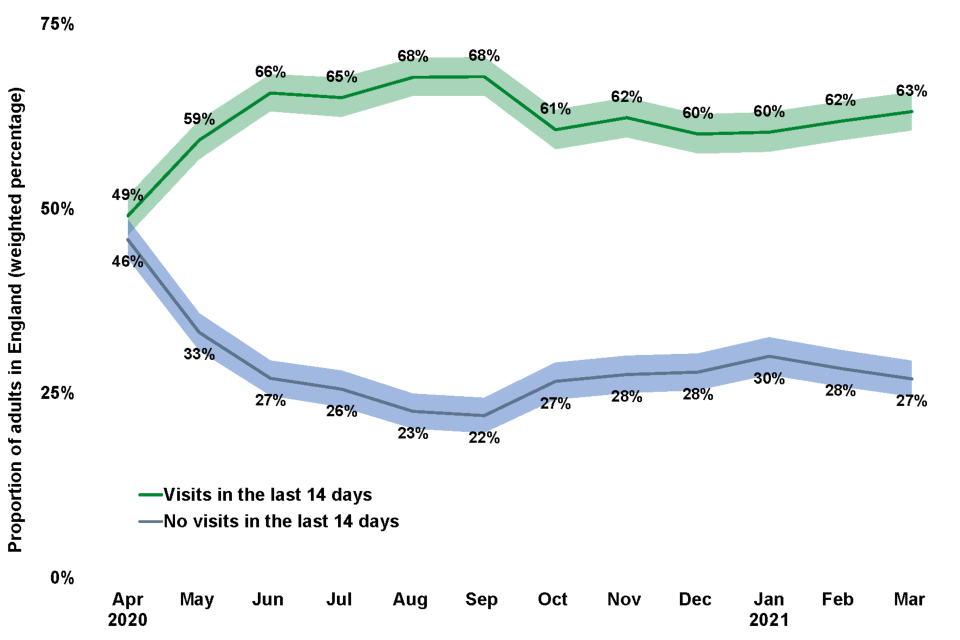 There was variation between months, with the proportion of adults that had taken a visit in the last 14 days highest between June and September 2020, and lowest in April (49%) 2020 (Figure 1).